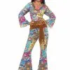 Dancing Queen Abba Catsuit. Laag uitgesnede catsuit, glimmend materiaal met patroon en uitlopende pijpen.