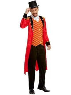 Deluxe Ringmaster Kostuum, bestaande uit het rode jasje met mockshirt en broek. Maak de look compleet met een bijpassende hoed en een zweep. Wij verkopen ook het Deluxe Ringmaster Kostuum voor dames en kinderen.