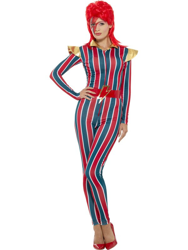 Miss Space Superstar Kostuum, bestaande uit een multi-gekleurde jumpsuit met riem.