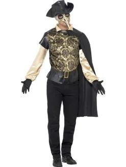 Plague Doctor Kostuum met cape, top met print en nep leren hoed. Het masker, tanden en schmink verkopen we los om het kostuum compleet te maken.