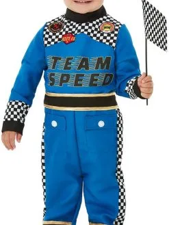 Ben jij ook zo een racefan? Shop dan dit geweldige Toddler Racing Car Driver Kostuum, bestaande uit de blauwe racing jumpsuit, pet en vlag.