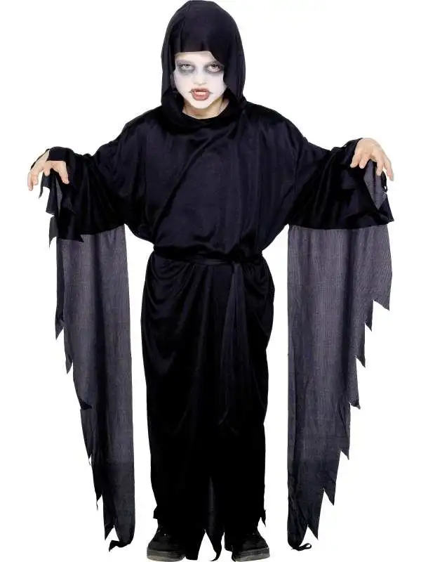 Screamer Ghost Kinder Halloween Kostuum. Inbegrepen is het zwarte gewaad met hoody en mouwen en de riem.