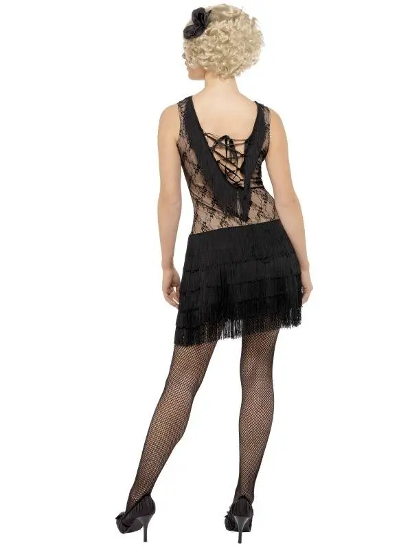 Sexy All That Jazz Dames Verkleedkleding. Inbegrepen is de jurk met kant en franjes en de haarclip met bloem.