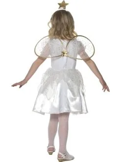 Star Fairy Meisjes Kostuum – mooi wit jurkje met gouden ster en gouden details, inclusief vleugels en diadeem met gouden ster.