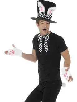 Maak jouw Alice in Wonderland look compleet met deze Tea Party March Kit, bestaande uit een zwart/witte hoed met konijnenoren, handschoenen, strikje en staart.