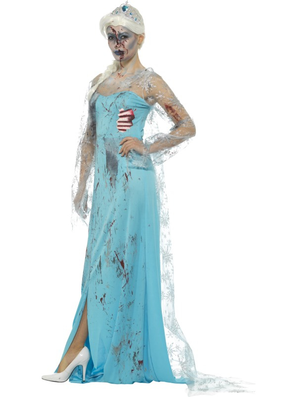 Kies eens voor wat anders tijdens Halloween en draag dit prachtige Zombie Froze to Death Kostuum, bestaande uit een ijsblauwe jurk met Latex Ribben & Tiara.